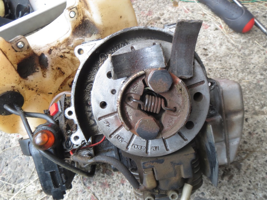 エンジンは動いているのでクラッチトラブル?月の宮作業所に戻りエンジンをオープン、自動遠心クラッチのパッドが2枚とも外れています。パーツ注文するしかないか?としょぼくれていると、カセットガス用刈払機のエンジンストックを思い出しました。キャブレターがダメになり、再入手が不可能でパーツ取りとして置いておいたものです。