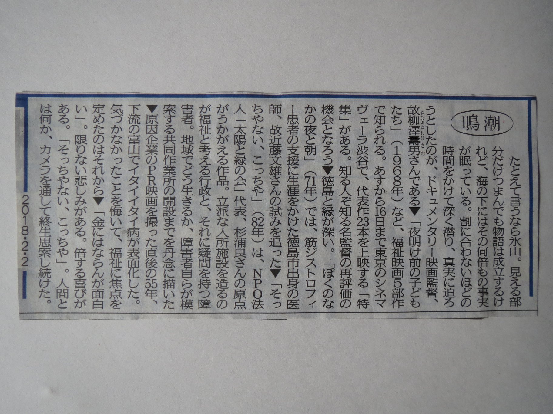 「徳島新聞『鳴潮』コラムニストが柳澤壽男監督を紐解く」通信 H30.2.2