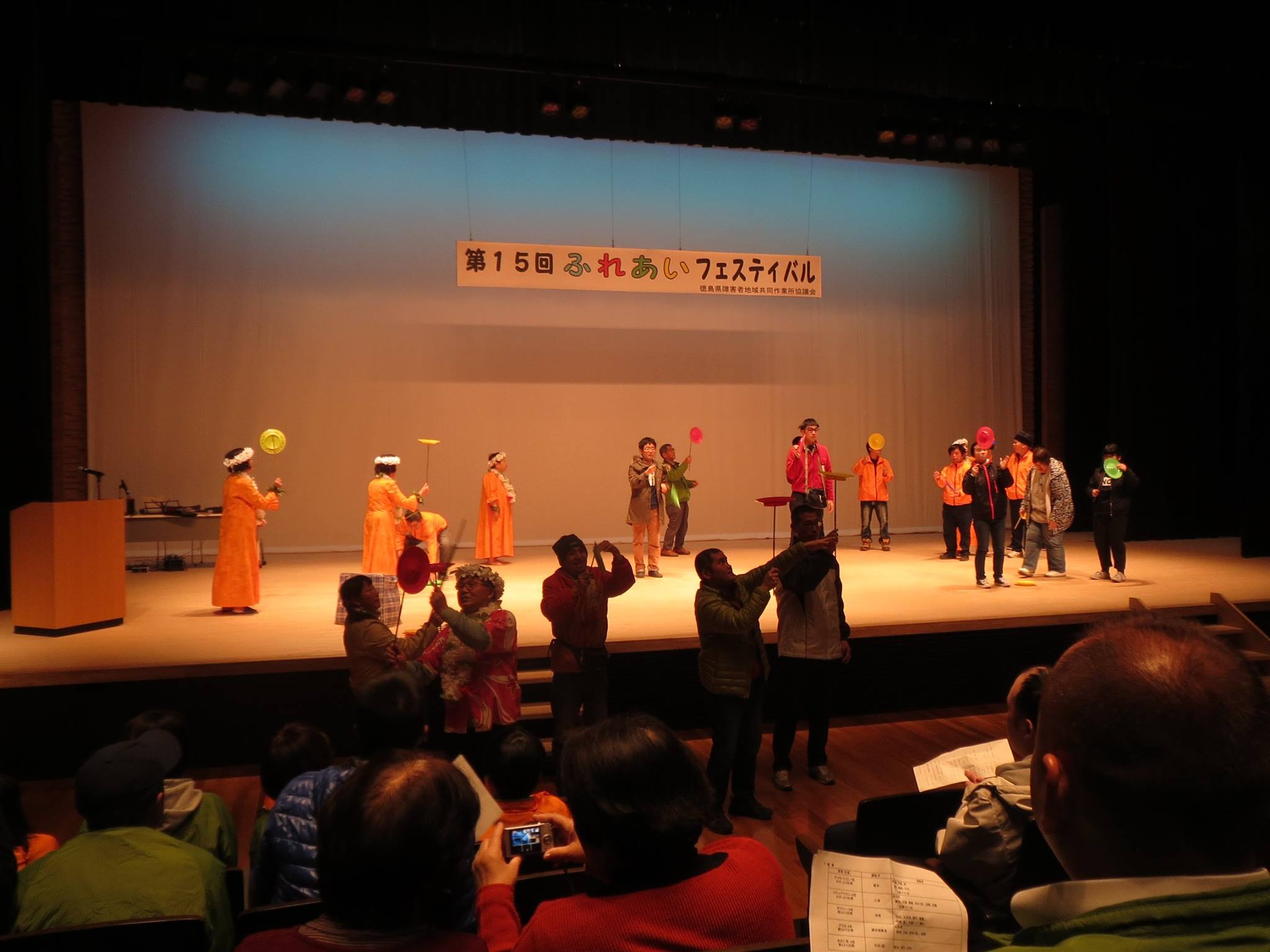 24日のクリスマスイブに、阿波市交流防災拠点施設アエルワで、第15回ふれあいフェスティバルが行われました。建って3年の真新しいホールに、県内11作業所・事業所が集まり、阿波市健康福祉部長安丸学氏の来賓挨拶の後、歌や踊り手話コーラスや演芸ショーなどを楽しみました。