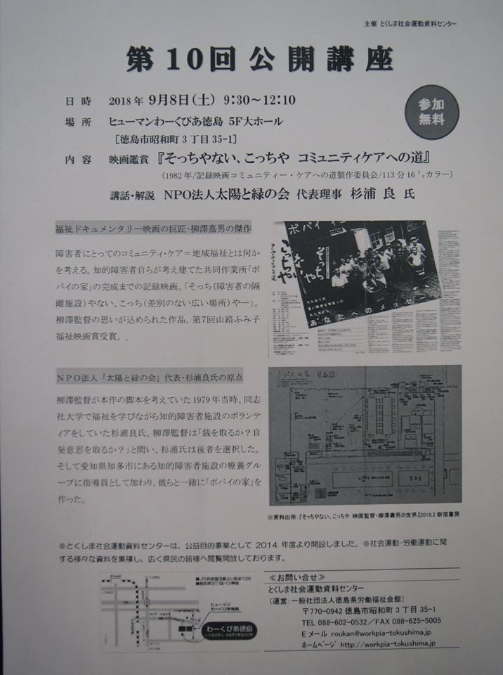2018年9月8日(土)9:30〜12:10、ヒューマンわーくぴあ徳島5階大ホール(徳島市昭和町3丁目35−1)にて、「そっちやない、こっちや コミュニティケアへの道」(柳澤寿男監督)映画会・講話会が行われます。