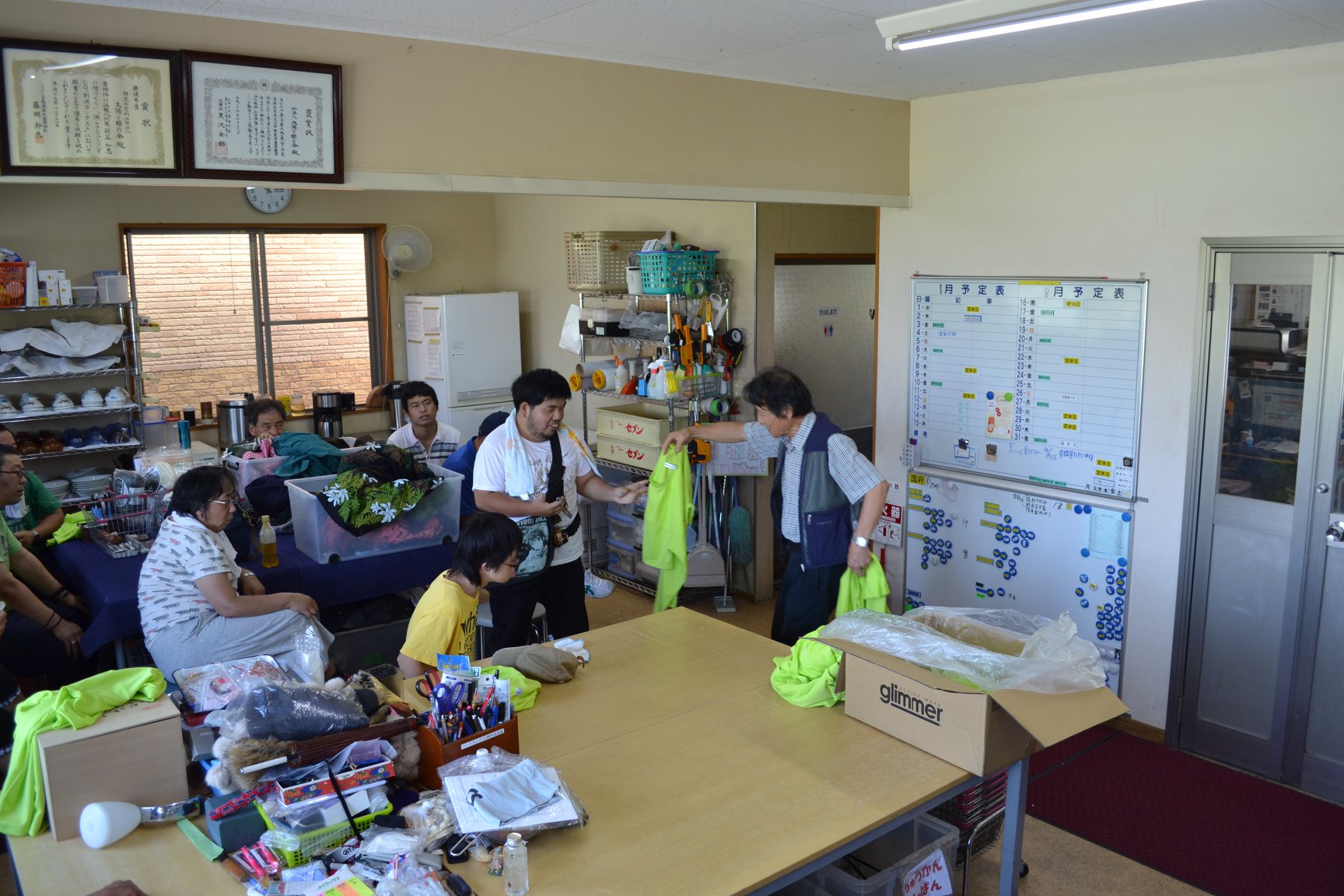段ボール箱の中から色鮮やかなTシャツを取り出すと、皆の視線が集まります。