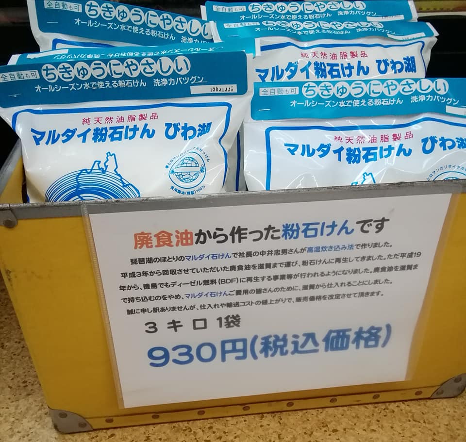 市民の皆様から回収させて頂いたテンプラ廃油(廃食油)は、平成3年7月より琵琶湖のほとりにあるマルダイ石鹸にて粉石けんにして頂き、それを徳島で販売する、という形でリサイクルしていました。1000リットル(ポリタンク約56本)のテンプラ廃油を2トントラックに積んで滋賀県大津市まで運び、粉石けん500袋(3キロ入り 1.5トン)を積んで帰る、ということを、5回に渡り行ってきました。