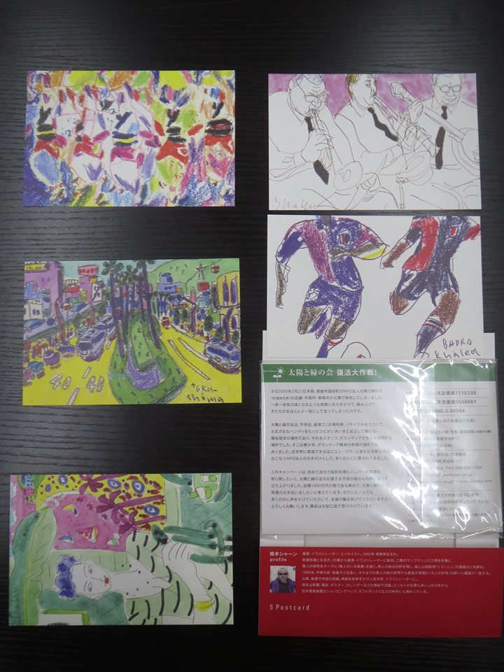 そんなご支援の中に橋本シャーンさんの絵葉書5枚セットがありました。いまだにお礼状等に使わせていただいていますが、リズミカルなタッチの描画に、顔を上げ、前を見られる明るさをもらった記憶があります。