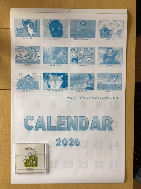 西山きんこさんが来年のカレンダーをプレゼントして下さいました。大判のものは太陽と緑の会レジの横の壁に、卓上用カレンダーはレジ横に掲示しています。