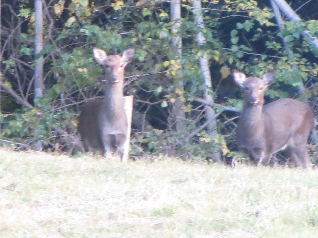 今年6月に落ちたビワを食べるシカ1頭を確認しましたが、今回は畑の草を食むシカ2頭に出くわしました。この42年間で初めての事。環境の変化に驚きです。(杉)