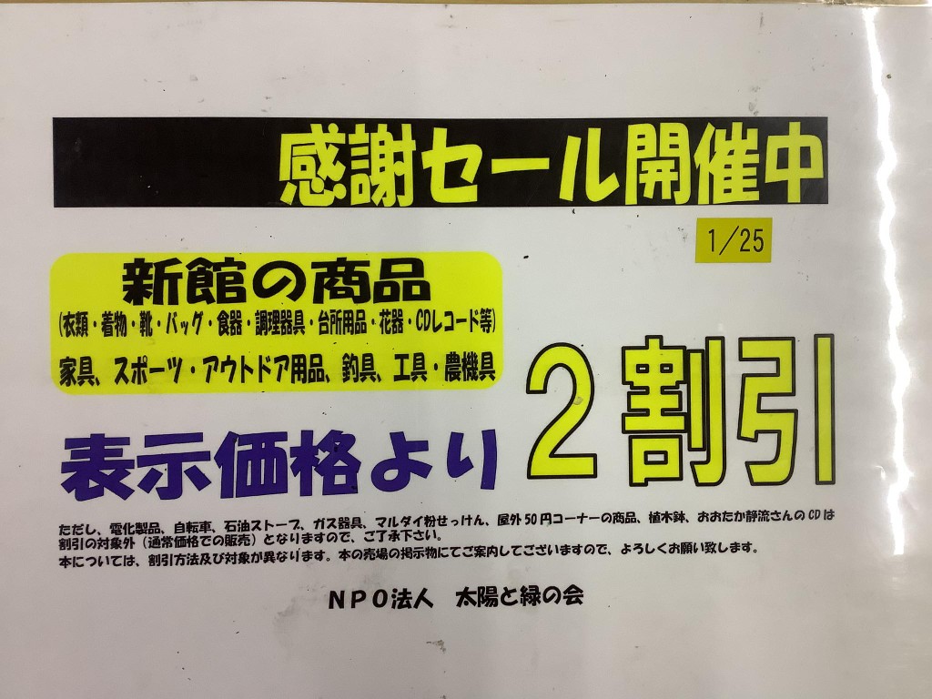 1/25(日)「冬の感謝セール」第2弾を開催します。新年明けて初めてのセール、1日限りの開催です。